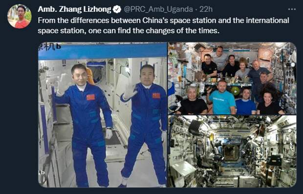 Различия между Международной космической станцией (МКС) и китайской орбитальной станцией «Тяньгун» показывают уровень развития технологий со временем, написал посол КНР в Уганде Чжан Лицжун 22 октября на своей странице в Twitter. «Из различий между китайской космической станцией и международной космической станцией можно узнать об изменениях времени», — говорится в сообщении.