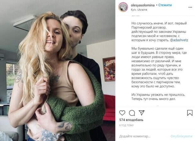 Известный украинский кондитер Олеся Соломина объявила о вступлении в однополый брак на территории Украины Об этом Олеся написала на своей странице в Инстаграм. "Брак - это о базовом ощущении безопасности и защищенности. В Украине ЛГБТ-люди не могут вступать в брак, а значит - не имеют всех этих точек безопасности.