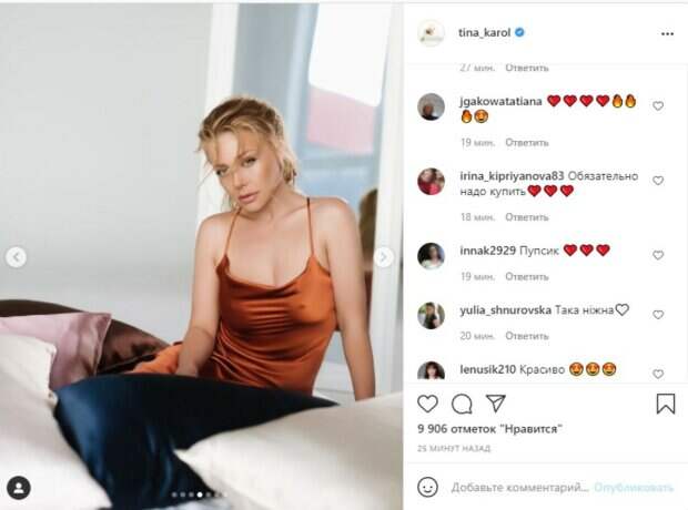 Ювелирные украшения, капсульная коллекция обуви, ароматичные свечи и даже собственная линейка духов и помады – все это Кароль часто рекламирует в профиле. В этот раз Тина пошла дальше, решившись на съемку в постели и показывая себя в тонком платье из шелка насыщенного оттенка. Чтобы кадр был более домашним и невинным, предстала звезда без лифчика и украшений. «Чтобы оставаться красивыми и лучезарными в сумасшедшем ритме, важно наполнять свою жизнь полезными привычками. И начинаются они со здорового сна. Бамбуковое постельное белье дарит ощущение легкости и прохлады в жаркие дни, а шёлковые наволочки заботятся о коже лица, не оставляя заломов после сна, и о здоровье ваших волос. Проявляй заботу к себе и к своему телу», - пишет Кароль, однако не отмечает стоимость комплекта. На сайте же указанная цена равна 4 950 гривен. Вот как реагируют на лук звезды фанаты: «