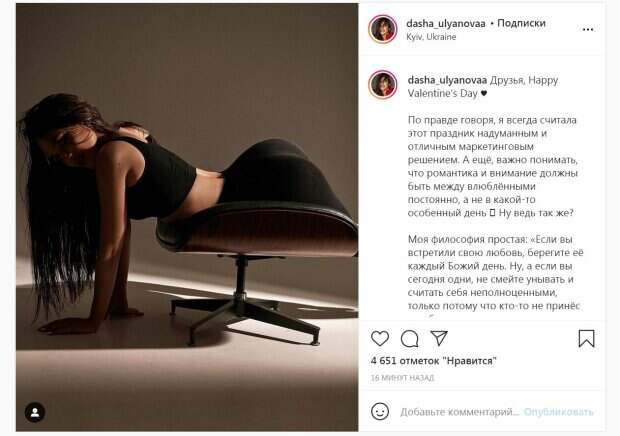 Победительница шоу подчеркнула свою грудь черным топом. Она распустила длинные волосы, и закинула их набок. Красотка кинула взгляд в камеру и приоткрыла губы. В посте Даша рассуждала о Дне влюбленных. По словам красотки, она всегда считала этот праздник надуманным. "Важно понимать, что романтика и внимание должны быть между влюблёнными постоянно, а не в какой-то особенный день