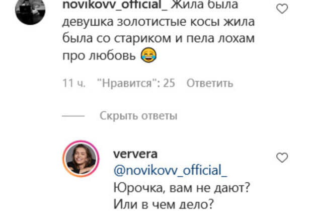 Личная жизнь артистов часто привлекает излишнее внимание публики. Вот и на этот раз, Брежнева поделилась в Инстаграм видео со своего выступления, а в комментариях один из пользователей прошелся по ее отношениям с мужем. «Жила-была девушка, золотистые косы. Жила-была со стариком и пела л**ам про любовь», - написал один из комментаторов. На это оскорбительное замечание певица ответила лично. «Юрочка, вам не дают?! Или в чем дело?», - написала она. Поклонники встали на сторону артистки. «Браво», «Вера, Вы молодец Удачи в жизни и работе», «Вера достойный ответ этим л**ам. Счастья вам, люблю вас ещё с Виагры», - говорится в комментариях. Ранее Брежнева показала, как позирует перед фотографом, пока ее стилист "колдует" над волосами, доводя до совершенства прическу звезды. При этом певица дарит самую очаровательную и даже немного загадочную улыбку и восхищает идеальными чертами лица. Напомним, юная дочь экс-ВИА Гры Брежневой без лифчика удивила развязной позой: "Сначала подумала, что Вера...". Как сообщала Politeka, страстная Брежнева показала свою сильную сторону в мужском костюме: "Джеймс Бонд...". Также Politeka писала, что Брежнева показала повзрослевших дочерей в трогательной фотосессии: "Три сестры".