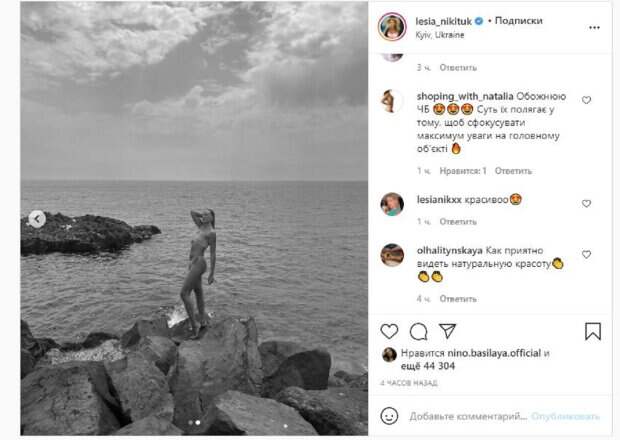 И Леся услышала молодого певца, отметив, что все будет, как он захочет. Никитюк также активно ведет Инстаграм, где делится с фанатами самым интересным.  В этот раз Леся опубликовала фото, на котором позировала в бикини на фоне моря. Красотка поделилась парой снимков, демонстрируя красоту в черно-белых цветах. "Понедельник - это всегда ЧБ", - написала Леся. Фанаты, включая победителя "Голосу" Лазановского, поставили более 44 тысяч лайков и написали комментарии: "Это очень красиво", "Ох и красивая", "Ну Афродита, слов нет", "Та заберите её кто-нибудь от таких красот, тут начинает уже жаба давить))", "Согласна, иногда так бывает, хочется ещё воскресенье продлить", "Как приятно видеть натуральную красоту". Напомним, Леся Никитюк поделилась неожиданными фактами из поездки в Португалию А еще Politeka сообщала, что Леся Никитюк без стеснения показала как ее "разнесло" на элитном курорте Также Politeka писала, что Никитюк оконфузилась в платье с разрезами во время фотосессии на яхте