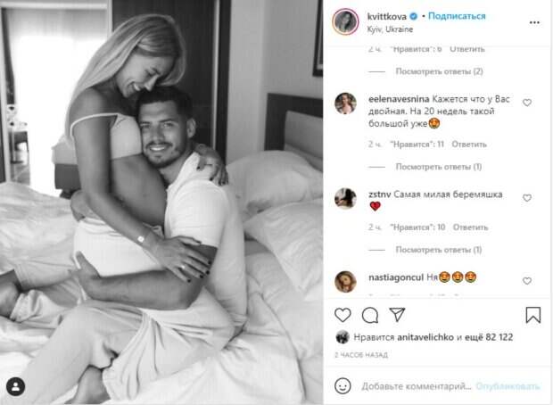 Несколько часов назад Квиткова решила также поделиться романтичным постельным фото с мужем, у которого сидела на руках. Девушка в одном лифе на тонких лямках и белых штанах прижалась в постели к мужу. Сам Никита радостно улыбался и позировал на камеру, придерживая беременную жену. В комментариях пользователи обсудили новый снимок и заодно засыпали счастливых будущих родителей новыми поздравлениями: «Вам не кажется что Никита немного поправился тоже)))?; Кажется что у Вас двойная. На 20 недель такой большой уже