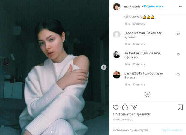 Дочь Кравец, с минимумом косметики, собрала волосы назад, хотя один локон непослушно упал на щеку, и томно посмотрела в камеру, поиграв оголенными плечиками. "Сам себя не сфоткаешь - никто не сфоткает :)", - подписала кадры Маша. Приглушенное освещение, нежные черты лица и юная красота - сделали свое дело, публика щедро одарила девушку комплиментами. "Снегурочка
