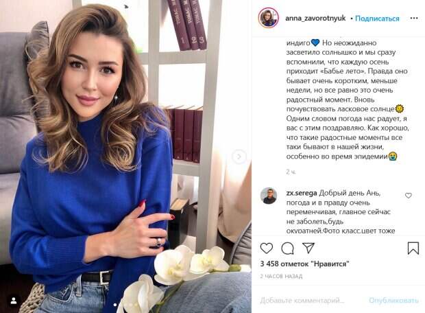 Она поделилась снимками в уютном свитере цвета индиго, рассказав о том, что уже решила приодеться для холодов, когда погода вдруг неожиданно изменилась. «Неожиданно засветило солнышко и мы сразу вспомнили, что каждую осень приходит «Бабье лето». Правда оно бывает очень коротким, меньше недели, но все равно это очень радостный момент. Вновь почувствовать ласковое солнце. Одним словом погода нас радует, я вас с этим поздравляю. Как хорошо, что такие радостные моменты все-таки бывают в нашей жизни, особенно во время эпидемии», - написала Заворотнюк. Ее поклонники тут же отреагировали на свежий пост знаменитости. «Как вам идет синий цвет», «Анна, Вы прекрасны», «Анечка, какая красавица», «Какая вы красивая дай бог вам счастья тепла солнца над головой что бы он светило ярко как вы», «Такая красота невероятная, Аня», «Как вам идёт улыбка очень красивая вы», «Вы вся в маму, красавица! Дай ей Бог здоровья!», «Копия мамы», - пишут люди. Напомним, дочь больной раком Заворотнюк сразила неожиданным образом в мини. Как сообщала Politeka, дочь Заворотнюк похвасталась миниатюрной талией и показала, чем себя ублажает перед холодами. Также Politeka писала, что дочь больной раком Заворотнюк в приспущенном свитере покорила естественной красотой: «Такая нежная».