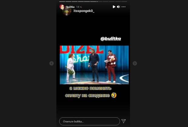 На этот раз актриса поделилась новой публикацией на своей странице в Инстаграм. Виктория добавила в Сториз видео с выступления на "Дизель шоу", где присутствовал популярный украинский певец Олег Винник. Они разыгрывали юмористический номер, где Виктория стала охранником артиста. "А мне можно поменять оплату на свидание? Олег будет петь "Вовчиця", а я буду подпевать", заявляет Виктория. В конце Олег Винник отвечает ей: "да". Комменатариев и лайков у публикации нет, поскольку формат Сториз этого не предусматривает. Ранее сообщали, Булитко из «Дизель шоу» заинтриговала видом с округлившимся животиком: «Ничего не замечаешь?» Также, звезды "Дизель шоу" в нижнем белье оригинально поздравили украинцев: "Это касается каждого" Politeka рассказывала, Булитко из "Дизель шоу" с декольте напоказ поразила откровением об отношениях с женатым: "Хочу жить со спокойной душой"