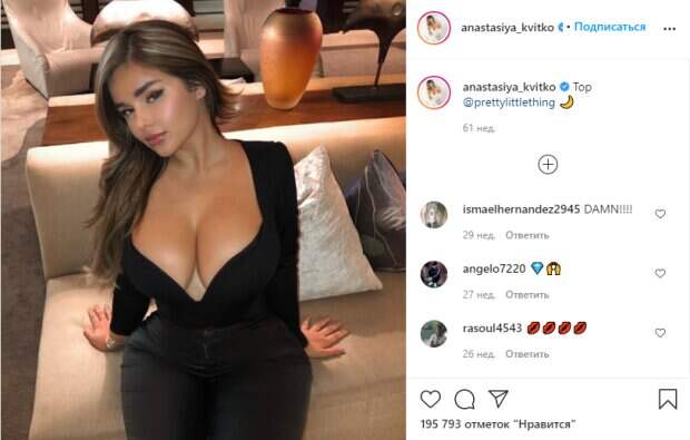 Поэтому девушка будоражит образами каждый раз по-разному. За обновлениями в Инстаграм звезды следят несколько миллионов фанатов, Настя не скромничает и публикует самые горячие фото со своих съемок. При этом образы знаменитости, которые отличаются от привычных, неизменно бурно обсуждают в сети. Даже в черной кофточке и очень тесных брюках модели удалось подчеркнуть свои главные достоинства – бедра и выдающийся бюст. «Вы хорошо выглядите во всем, что носите ❤», «Хорошо я вижу места для поцелуев», «Прекрасная девочка. Это высшая красота, которая прекрасна», «ты хочешь, чтобы Хариуп видел тебя для поцелуев везде», «Какая красивая грудь и как богато они выглядят», «Леди номер один