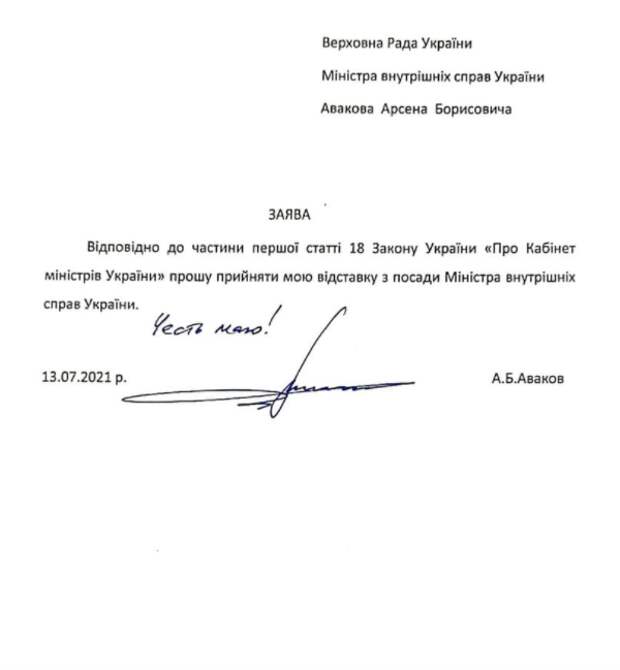 Министр внутренних дел Украины Арсен Аваков подал в отставку. Заявление опубликовано на странице ведомства в Facebook. «Согласно части первой статьи 18 закона Украины «О кабинете министров Украины» подал заявление об отставке с должности министра внутренних дел», — говорится в нем. фото: скриншот Верховная рада может рассмотреть заявление главы МВД 15 июля.