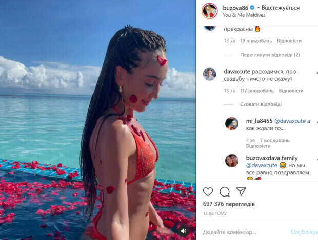 Звезда телепроекта "Дом-2", телеведущая и певица Ольга Бузова побаловала фанатов откровенными кадрами Как пишет Politeka.net, у себя в Инстаграм красотка опубликовала видео с Мальдив, где она отдыхала вместе со своим парнем Давой. Певица была одета в мини-бикини красного цвета. Она позировала в маленьком бассейне, украшенного лепестками красных роз.