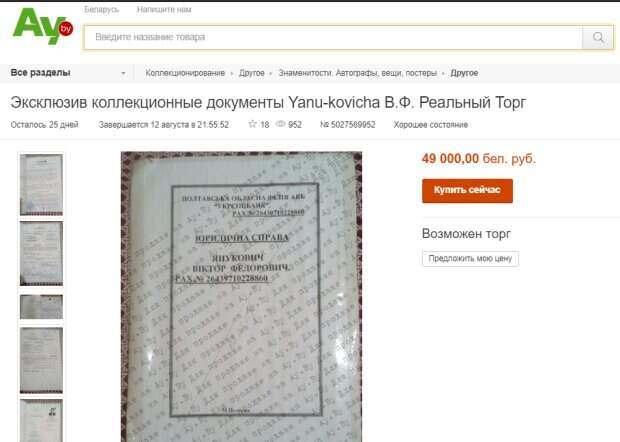 На одном из беларуских аукционов пустили с молотка "юридическое дело" экс-президента Украины Виктора Януковича, испугавшегося наказания и сбежавшего из страны Стоимость "эксклюзивных коллекционных документов" стартует от 49 тысяч беларуских рублей (более 560 тысяч гривен). Отмечается, что возможен торг.