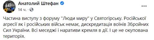 Участница форума УПЦ МП в Донецкой области украинских военных обвинила в мародерстве при освобождении Донбасса С такими преступными заявлениями в духе кремлевских пропагандистов выступила одна из спикеров, заявив, что ВСУ "освободили их от всего". На антиукраинское выступление обратил внимание офицер ВСУ, полковник Анатолий Штефан (Штирлиц), опубликовав соответствующий пост в Facebook (чтобы посмотреть видео доскрольте до конца страницы).