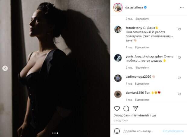 Как видно, на новых снимках Даша запечатлена в интересной локации, это тусклая комната с приглушенным светом. Перед камерой звезда появилась в весьма соблазнительном образе – на ней черный кружевной корсет, который едва удерживает пышное декольте, а на плечо она накинула темный пиджак. Волосы красотки собраны в элегантную прическу, а на ее лице аккуратный макияж, она не смотрит в объектив. В подписи к фотографиям Астафьева загадочно написала: "Отопительный сезон внутри закончен. Об этом свидетельствуют факты из разряда «никаких больше вечеринок» и «я рисую старые картины»". Пользователи в восторге от новых снимков звездной красотки, ее засыпают комплиментами в комментариях: "Самая лучшая", "Святые небеса", "Женщина моей мечты", "А знаете, я в тысячный раз скажу, что Вы очень красивая", "Королева", "Полиция красоты где?", "Даша, какая красота", "Настоящая леди", "Красотка", "Прекрасно", "Глаз не оторвать", "Очень глубоко… третья шедевр", "Читать тяжело, что написано под фото". Напомним, мы рассказывали о том, Даша Астафьева загремела в больницу со страшным диагнозом, певица ошарашила подробностями. Как сообщала Politeka, Астафьева и Никитюк в бесстыжих мини затмили эффектными формами саму Каменских: "Банда красоток! ". Также Politeka писала, что Плакидюк из "Супер топ-модель по-украински" подловила Дашу Астафьеву в тот самый момент: "Бюстгальтер не…".