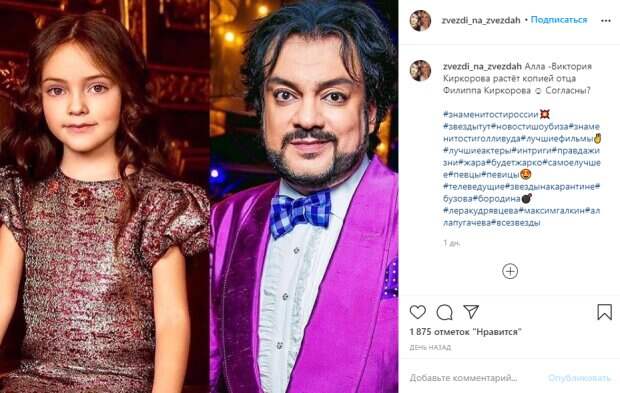 В сети обсуждают необычную внешность 8-летней дочки певца Филиппа Киркорова Аллы-Виктории Как передает Рoliteka.net, горячие споры развернулись под фото, опубликованном на одной из фан-страничек поп-короля в Инстаграм. В коллаже представлены малышка Алла-Виктория и ее звездный отец. "Алла-Виктория Киркорова растёт копией отца Филиппа Киркорова ☺️ Согласны?
