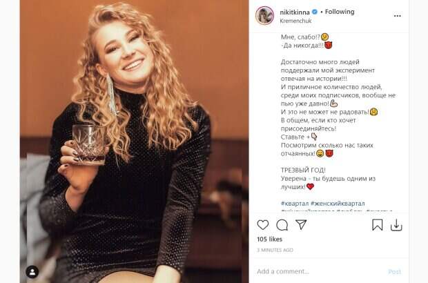 Екаатерина Никитина села на стул со стаканом в руках, платье при этом слегка задралось и обнажило ее бедро. Видимо, красотка уже успела выпить, а потому не обратила внимание на такие мелочи и просто подарила поклонникам обворожительную улыбку. "Этот год уже приготовил для меня много испытаний!✨ Меня взяли на слабо...