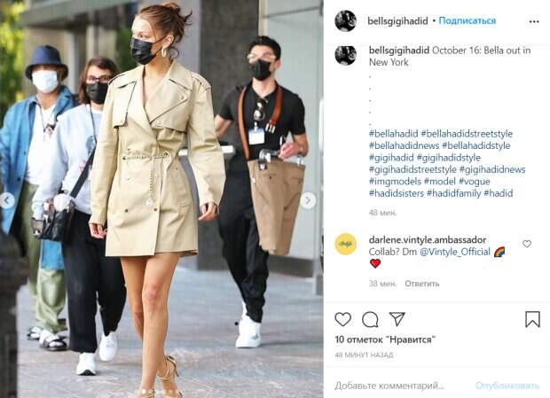 Вездесущие фанаты Беллы засекли девушку на прогулке в Нью-Йорке. При этом на ней откровенный наряд. В частности, Белла надела бежевое платье-пальто с небольшим запахом и расклешенной к низу юбкой, которое выглядело достаточно строго, но в то же время женственно и соблазнительно. По всей видимости, свою роль сыграл эффект надетой на голое тело верхней одежды. Дополнили образ золотистые боссоножки на высоком каблуке. Волосы модели были уложены в пучок. В макияже ей подчеркнули глаза. Последний штрих – хайлайтер, который покрывал кожу влажным сиянием. Кроме того, она не проигнорировала защитную маску. Выглядит Белла, которая всегда восхищает поклонников молодостью и красотой, просто обворожительно. Камера засекла ее в тот момент, когда Белла сдавливает руками свой бюст, поправляя пальто. Пользователи сети оставили под снимками множество комплиментов, ведь никто не смог оторвать взгляд от такой красоты. "Совершенство", "Оглушающий", "Я умираю, она выглядит такой нереальной", "Ты такая горячая перчинка