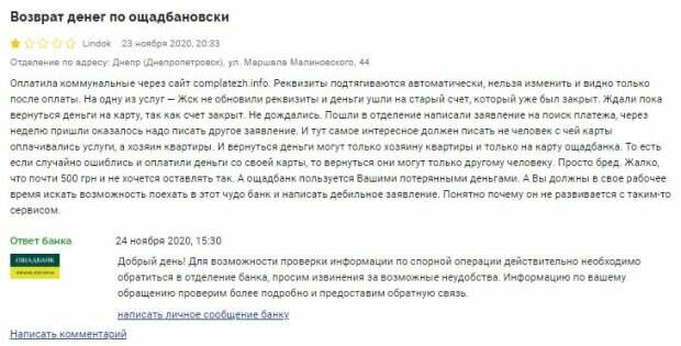 "Пошли в отделение написали заявление на поиск платежа, через неделю пришли, оказалось надо писать другое заявление. И тут самое интересное: должен писать не человек, с чей карты оплачивались услуги, а хозяин квартиры. И вернуться деньги могут только хозяину квартиры и только на карту ощадбанка", - продолжает недовольная клиентка. Она добавила, что Ощадбанк спокойно пользуется деньгами клиента, пока он в отделениях пытается добиться их возврата. "Если случайно ошиблись и оплатили деньги со своей карты, то вернуться они могут только другому человеку. Просто бред. Жалко, что почти 500 грн и не хочется оставлять так. А ощадбанк пользуется Вашими потерянными деньгами. А Вы должны в свое рабочее время искать возможность поехать в этот чудо банк и написать дебильное заявление. Понятно почему он не развивается с таким-то сервисом", - эмоционально подытожила клиентка в жалобе на Минфине. "Добрый день! Для возможности проверки информации по спорной операции действительно необходимо обратиться в отделение банка, просим извинения за возможные неудобства. Информацию по вашему обращению проверим более подробно и предоставим обратную связь", - отреагировал на проблему представитель Ощадбанка. В комментариях под жалобой клиентка добавила, что деньги даже спустя месяц не вернулись ей на счет. Напомнить, Ощадбанк отказывает в закрытии банковских карт и блокирует денежные переводы Как сообщала Politeka, Деньги украинцев в Ощадбанке воруют через банкоматы Также Politeka писала, что Массовая блокировка карт "Ощадбанка", украинцы остаются без пенсий и соцвыплат