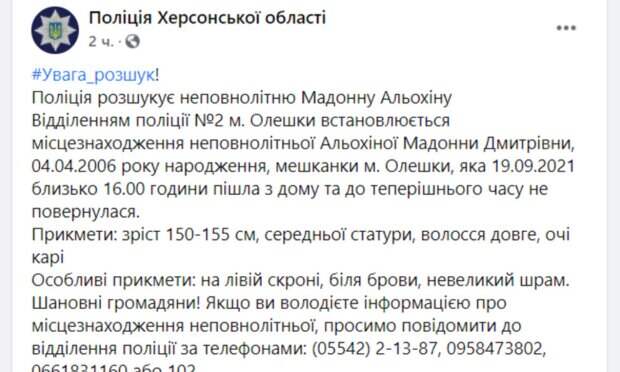 Полиция обьявила розыск несовершеннолетней девушки с редким именем Полиция разыскивает несовершеннолетнюю Мадонну Алехину, жительницу Олешки в Херсонской области. Об этом говорится на странице областной полиции в Facebook. Около 16 часов 19 сентября она ушла из дома и до настоящего времени не вернулась.