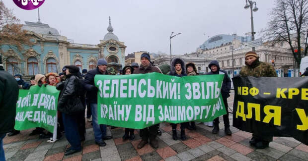 ». Источник: Klymenko Time Участников и организаторов акции не устраивает, что МВФ ставит нашему правительству все новые условия и еще больше загоняет государство в долги, которые лягут на плечи следующих поколений. «Людей будут превращать в скотов, которые будут просто убивать друг друга! Наша страна должна МВФ 92 миллиарда долларов! Дают деньги в неограниченном количестве под проценты, под гарантии, что правительство Украины будет выполнять все указания МВФ. Поднять цены на газ? Подняли! Поднять на электроэнергию? Повысили! И не смотрят, какие у вас доходы. Либо плати, либо — вон из квартиры», — говорит женщина в мегафон. Источник: Klymenko Time Люди также стоят с плакатами «МВФ, забери свои бусы, мы — не аборигены», «МВФ — безлюдная страна», «Зеленский, сними с Украины петлю». Источник: Klymenko TimeИсточник: Klymenko Time Постепенно акция, которая была под Камбином, перекочевала под Раду и шум под парламентом удвоился. Люди хором скандируют: «Стоп, кредиты МВФ!». Кто-то принес с собой маску премьер-министра Дениса Шмыгаля. Выглядит зловеще. Источник: Klymenko Time Особый акцент делается на том, что в долговой кабале виновата предыдущая власть во главе Петром Порошенко, однако ее представители продолжают «занимать 99% должностей на государственной службе». Несмотря на неважную погоду (в столице +2°C с дождем), людей собралось много. Насчитывается, как минимум, пара сотен человек. Источник: Klymenko Time Участники митинга пришли без опознавательных знаков. На плакатах нет партийной символики. Единственное, кое-где встречаются желто-голубые флаги. Ранее мы освещали протесты предпринимателей, требующих отменить введение РРО. Они длятся еще с ноября. Друзья, наш основной YouTube-канал Klymenko Time на неделю остался без возможности публикаций видео, проведения эфиров и публикации постов в разделе «Сообщество». Пока имеем такую ситуацию, предлагаем подписаться на наш новый канал — https://www.youtube.com/KlymenkoTimeLIVE?sub_confirmation=1 На этой неделе там будут выходить не только ежедневные эфиры, но и все влоги наших авторов и репортажи по ситуации в стране.