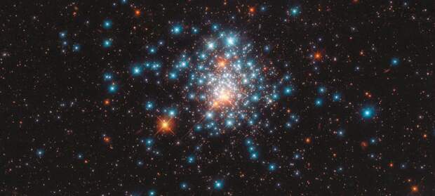 Телескоп "Хаббл" сфотографировал необычное шаровое скопление (NGC 1805) звезд в Большом Магеллановом Облаке. В скоплении насчитывается тысячи звезд, снятых в ультрафиолетовом и инфракрасном свете.Будто бы все звезды стремятся в одну точку.Плотность звезд в центре скопления в 100–1000 раз выше, нежели ближайшие звезды к нашему Солнцу.