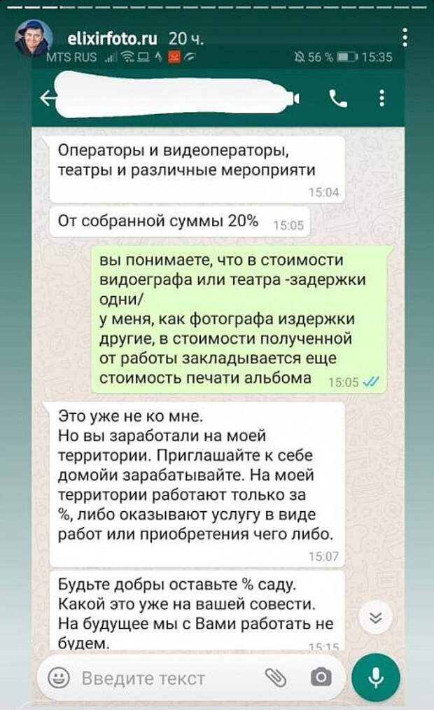 Фотограф из Набережных Челнов Александр Великов рассказал, что заведующая одного из детских садов города начала требовать у него процент за работу «на ее территории». Переписку с ней он опубликовал в своем Instagram. Со слов женщины, за работу на ее «территории» необходимо платить процент. Спустя время Великов в своих Instagram-stories выложил скрины СМИ, написавших об инциденте и сопроводил это комментарием: «Надеюсь, урок будет для всех.