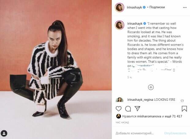 Ирина немного удивила внешним видом, ведь предстала в теплом свитере. Наряд был необычным - его рукава разделились на несколько частей, и из них показывались обнаженные руки Шейк. Кроме того, свитер нисколько не подчеркнул идеальных форм красотки, что немного расстраивало, ведь фигура у знаменитости - невероятная. Правда, можно было вдоволь полюбоваться одними из достоинств знаменитости - стройными ножками. Шейк присела на корточки расставив ноги в черных ботфортах. При этом взгляд модели был пристальным. Волосы звезда забрала в высокий длинный хвост, что и стало отличным завершением столь интересного образа. «Я так хорошо помню, как во время кастинга на меня смотрел Риккардо. Он курил, и казалось, что я знаю его десятилетиями. Особенность Риккардо в том, что он любит разные женские тела и формы, и он знает, во что их одевать. Он родился в семье с восемью сестрами, и он очень любит женщин. Это особенное", - написала Ирина Шейк. В посте речь идет о Риккардо Тиши - главе лондонского модный дома бренда одежды "Burberry". За час пост собрал более 70 тысяч лайков и много комментариев. Пользователи сети отметили, что им очень нравится не только модель, но и ее свитер. "Вау, какая дерзкая", - написал один из фанатов. Напомним, что Ирина Шейк нашла неожиданную замену Куперу, фото с красавчиком облетели сеть: "Оказался известным...". Как сообщала Politeka, Ирина Шейк ошарашила снимком в постели с Путиным, сеть кипит: Брэдли Купер будет в ауте. Также Politeka писала, что Ирина Шейк показала, как выглядела 20 лет назад: "Эх, были времена".