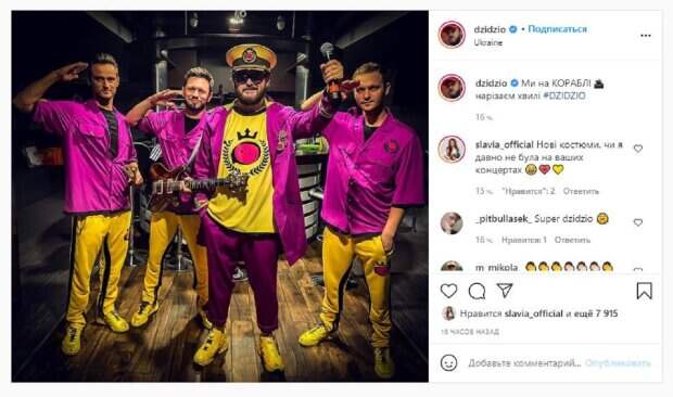 На новом фото Михаил позировал в розово-желтом костюме. Рядом с ним стояли остальная команда. "Мы на корабле нарезаем волны", - написал Хома. "Новые костюмы или яя давно не была на ваших концертах", - написала Ярослава под фото. "Вау, шикарные", "Вы лучшие", "А где люлик", "Очень крутой прикид, где купить?", "Плывите в Умань. Мы вас с нетерпением ждем", "Хорошо отыграть на свадьбе", "Ну очень стильные", "А скоро выступать на одной сцене! До встречи, и счастливого плавания Вашей команде", "Круто, ребята, скучаем по концертам", "Блин, прикид вообще огонь", "Я бы пошла в круиз с таким капитаном". Напомним, примирение Дзидзьо с экс-женой Slavia, в Сети появились фото и подробности А еще Politeka писала, что певица Slavia показала, как наслаждается жизнью после развода с Дзидзьо Также Politeka сообщала, что Дзидзьо после развода со Slavia разоткровенничался с Осадчей о новой любви