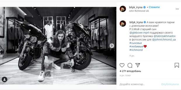 Украинская певица Ирина Билык недавно опубликовала редкие фото своего старшего сына Глеба Оверчука Как передает Politeka.net, артистка показала, как вырос парень, который позировал в шоуруме среди одежды и мотоциклов. Ирина объяснила, что Глеб пришел поддержать своего младшего братика Табриза в фотосессии для бренда John Richmond.
