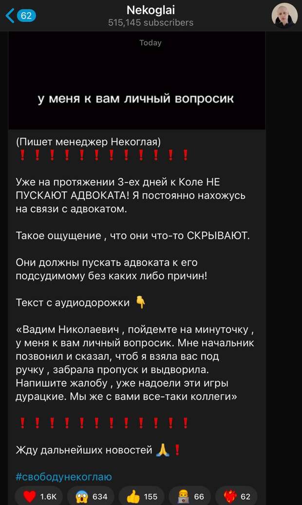 Менеджер блоггера Некоглая (Николая Лебедева) сообщил в Telegram-канале Лебедева, что к нему не пускают адвоката уже третий день подряд. Об этом сообщил telegram-канал ВПШ. Он прикрепил аудиозапись и продублировал ее текстом. Женщина на аудиозаписи сказала следующее: «Вадим Николаевич , пойдемте на минуточку , у меня к вам личный вопросик.