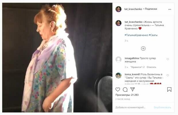 net со ссылкой на страничку фан-сообщества. "«Жизнь артиста очень стремительна.» — Татьяна Кравченко", - написал администратор. Фанаты посмотрели ролик более 20 тысяч лайков и написали комментарии под кадрами: "Просто супер женщина", "Роль Валентины в ''Сваты'' это супер ! Вы Татьяна - народная и заслуженная актриса !!!! Вы наша!", "вы просто, замечательная актриса! Уже не знаю, сколько пересмотрела, "Сватов"! Каждый, день смотрю не могу оторваться! Обожаю,вас и всех других актеров! И сам сериал!", "Замечательное видео, уважаемая Татьяна! Настрой, концентрация, душевная красота, трепет... Успехов!!!", "Большого творческого долголетия и здоровья ! Вы самая обаятельная ,привлекательная и искренняя женщина . Вашей семье повезло !", "Замечательная". Сообщалось, что известная актриса Татьяна Кравченко, звезда сериала "Сваты", показала необычный образ. На фото Кравченко позирует в красной форме продавщицы, позируя за прилавком. Татьяна дополнила образ бело-голубым кокошником, который красовался у нее на голове. Напомним, Валюха из «Сватов» засветилась с известной актрисой А еще Politeka писала, что Валюха из "Сватов" озадачила снимком после заявления о беде Также Politeka сообщала, что Валюха из "Сватов" изменилась до неузнаваемости и поразила признанием