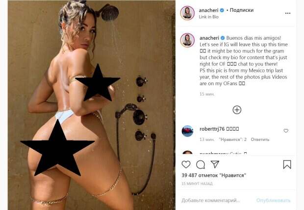 Кроме этого, цепочки впились в кожу ног. Красотка стояла к камере спиной, давая насладиться видами упругих ягодиц. Модель прикрыла грудь, чтобы не было видно самого сокровенного. Ана собрала волнистые волосы в пучок и посмотрела в камеру, приоткрыв губы. В таком виде знаменитость предстала под летним душем, она намочила тело, отчего кадр стал казаться еще эффектнее. "Это фото из моей прошлогодней поездки в Мексику", - написала Ана. Всего за 15 минут пост собрал почти 40 тысяч лайков и много комментариев. Пользователи сети выражали свой восторг, описывая горячий снимок приятными словами. Стоит отметить, что сейчас на страницу звезды подписаны 12,5 миллиона пользователей сети. Эту популярность в сети звезда заработала не сразу. Стартом карьеры для модели стало размещение фото и советов по фитнесу на странице в Instagram. В результате на звезду обратили внимание фешн-бренды Калифорнии. Таким образом популярность красотки стала стремительно расти и в 2013 году модель даже получила титул «Сybergirl» эротического журнала «Playboy». Сейчас звезда выпускает свою линию одежды. Напомним, Ана Чери поплескалась на курорте, приспустив мокрый топ с плеч А еще Politeka писала, что Ана Чери покрутила "орешком" перед зеркалом в тесных лосинах Также Politeka сообщала, что Ана Чери задала жару, выпятив румяные "булочки" на тренировке