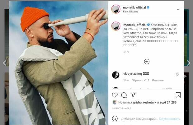 Украинский певец, судья шоу "Голос країни", Дима Монатик неожиданно разоткровенничался Артист активно ведет страницу в Инстаграм, где делится своими мыслями и рассказывает о творчестве, пишет Politeka.net. В этот раз певец удивил откровением, обратившись к украинцам. Монатик опубликовал фото, на котором смотрел в подзорную трубу.