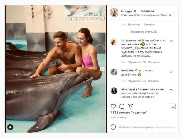 На втором видео супруга уже показывала, как гладит этих дивных существ, а на последнем фото - вместе с ними плавает. Об этом пишет Politeka.net со ссылкой на страничку знаменитости. "Все случилось не так как планировалось, я чуть-чуть расстроилась, но не менее счастлива! Была у меня мечта поплавать с дельфинами, и так как мой Вова знал о ней, спланировал для нас два прекрасных дня в Одессе на праздник 8 марта. Благодарю Владимир Остапчук", - написала Кристина под публикацией. Фанаты поставили более 4 тысяч лайков и написали комментарии, многие - осудив за дельфинов: "Очень жалко дельфинов", "Блин, ребятки, но они же живые, а их так мучают((( Кристина, вы такая чудесная! Но эту публикацию лайкать не хочеться...", "Странно что вы не видели публикаций как на самом деле обходятся с дельфинами, у всей этой милоты есть обратная сторона медали... Дельфины там не живут, а мучаются, их нахождение в хлорированной воде губительно... И Немо не исключение, именно про них и читала ужасные истории. Никогда не поведу своих детей туда...", "Класс молодец Владимир !сюрприз, просто бомба". Напомним, жена Остапчука смело распахнула халатик и показала, чем покорила телеведущего А еще Politeka писала, что Остапчук с женой окончательно обнаглели и показали, что вытворяют субботним вечером Также Politeka сообщала, что новая жена Остапчука кайфонула на прогулке с мужем, кадры идиллии