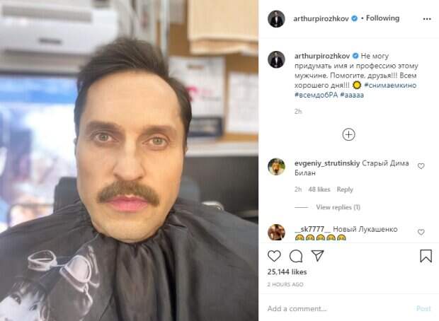 На снимке Александр Ревва предстал будто другим человеком, в первую очередь, благодаря густым усам под носом. Судя по обстановке, над внешностью артиста только-только поработали гримеры - он сидит в кресле, по шею укрытый накидкой. У шоумена можно заметить довольно короткую прическу-ежик с пробором. "Не могу придумать имя и профессию этому мужчине. Помогите, друзья!!! Всем хорошего дня!!!", - подписал фото Александр Ревва. Пользователи социальной сети тут же ответили на призыв артиста и предложили свои варианты в комментариях, многие отметили схожесть актера с другими знаменитыми личностями: "Дон пеппероне, колбасобарон