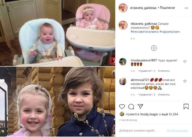 В кадре малыши сидят в специальных детских креслах. При этом Гарри мило улыбается в камеру, а его сестренка испуганно смотрит на фотографа. Снизу наследники Пугачевой и Галкина уже подросли. Лиза была одета в белую косынку и розовое пальто, а Гарри выбрал синюю курточку. В руках малыши держали веточки вербы. "Сильно изменились?