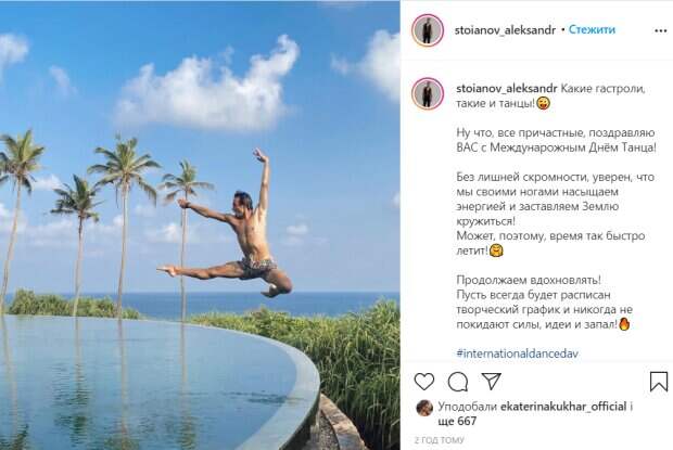 Известный украинский артист балета Александр Стоянов показал, как вместе со своей женой, балерине и судье шоу "Танці з зірками" Екатерине Кухар прзднуют профессиональній праздник Танцор поделился новым постом в своем Іnstagram, в котором рассказал все, что думает о танцах. Об этом пишет Politeka.net.