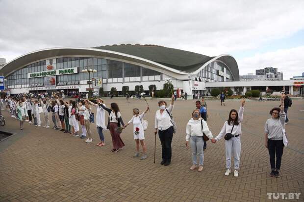 Белорусская оппозиция сегодня утром провела чисто женскую акцию. У Комаровского рынка (символическое место, здесь проходил самый массовый сбор подписей за альтернативных кандидатов перед выборами) выстроилось порядка сотни девушек в белых одеждах. Таким образом они протестовали против милицейского насилия.