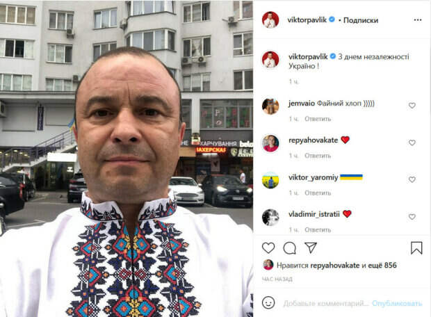 Павлик был одет в белоснежную вышиванку с ярким узором. Артист позировал на фоне парковки, явно довольный собой. «С Днем Независимости, Украина!», - коротко поздравил страну с праздником Павлик. Под постом артиста тут же отметилась его молодая жена и, по совместительству, концертный директор певца – Екатерина Репяхова. Она оставила под снимком смайлик в виде сердечка. Поклонники Павлика также принялись комментировать пост. «Файний хлоп», «Огонь», «Виктор как хорошее вино – с годами только лучше!», «Поздравляю!», «Поздравляю брат! Очень красивая вышиванка», - пишут в комментариях. Отметим, что в начале этого лета Павлик снова стал отцом – у них с его четвертой по счету женой родился сын, которого назвали Михаил. Напомним, молодая жена Виктора Павлика заговорила о пластической операции. Как сообщала Politeka, молодая жена Павлика дала своему сыну важное обещание и показала, как он подрос. Также Politeka писала, что Виктор Павлик раскрыл, куда ушли деньги, полученные от украинцев на спасение сына.