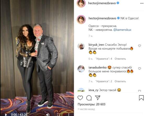 Кадрами из концерта он поделился в сети Instagram. Фото было сделано за кулисами. Звезды, как всегда, выбрали стильные наряды. На Каменских – золотистая блуза с пикантными элементами декора, под которой хорошо видно белье – черный лиф, черные лосины и лаковый тугой корсет. Макияж Насти был сделан с акцентом на глаза, на губах играет трендовая нюдовая помада, волосы распущены. Эктор облачился в серый деловой костюм, который дополнила белая рубашка с ярким принтом и лоферы на толстой подошве. Звезды обнимают друг друга и счастливо улыбаются на камеру. "NK в Одессе! Одесса - прекрасна. NK - невероятна", - восхитился Эктор в подписи к кадрам. Поклонники пришли в восторг и снова отметили, что Эктор Хименес-Браво умеет эффектно себя подать. Некоторые поблагодарили его за видео с концерта Каменских. Были и те, кто заметил, что повар выглядит очень счастливым рядом с певицей, заподозрив его во влюбленности в Настю. "Эктор такой