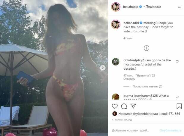 Известная модель, ангел из Victoria’s Secret, Белла Хадид, показала всю свою стройность в мини-бикини Звезда опубликовала серию ярких снимков с отдыха, передает Politeka.net. Хадид всегда находит время для публикации фото, на которых демонстрирует свою изящную фигуру. Модель бала в обтягивающем лифчике, который напоминал топик, он обтянул небольшую грудь знаменитости, немного стиснув ее.