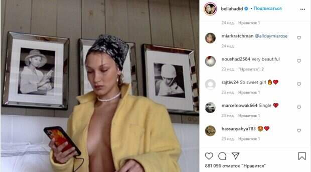 Известная модель Белла Хадид показала себя вместе с молодым человеком На фото красотка показала себя в кофте с декольте максимально близко. Модель оставила открытой зону декольте, из которой прямо выпирал бюст. Рядом можно увидеть молодого человека, визажиста Хадид, который был в бейсболке и джинсовой куртке.