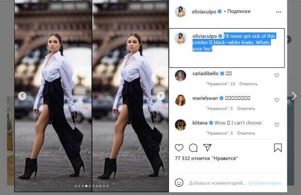 Модель опубликовала серию фото, в которых использует комбинацию черно-белых цветов. На одном из фото Калпо позировала в белоснежной рубашке, первые пуговицы которой были расстегнуты. Последний факт прибавлял образу большей соблазнительности. Подчеркнула тонкую талию юбочка на завязке. Крой наряда был необычным, ведь впереди оголились ножки, а сзади был длинный шлейф. Ботильоны были на шпильках и удлиняли стройные ножки. В таком виде звезду сфотографировали на фоне Эйфелевой Башни. "Я никогда не устану от этой комбинации черный + белый лук. Что вам нравится?", - подписала снимки модель. Ранее сообщалось, что Оливия Калпо родилась в мае 1992 года. Кроме нее в семье есть еще четверо детей. Звезда с детства занималась музыкой - играла на виолончели. Все благодаря родителям - профессиональным музыкантам. В одном из интервью модель призналась, что в школьные годы была "в теле", потому что, как и все сверстники, не задумывалась об ограничении в еде. За это девочка и подвергалась неоднократным насмешкам со стороны одноклассников. Напомним, «Мисс Вселенная» Оливия Калпо заставила любоваться собой, подобрав самый жаркий ракурс А еще Politeka сообщала, что "Мисс вселенная" Оливия Калпо в жаркой позе на столе показала, что у нее под юбкой Также Politeka писала, что "Мисс Вселенная" Оливия Калпо засветила свои сочные "дыньки", задрав мини-топ прямо на улице