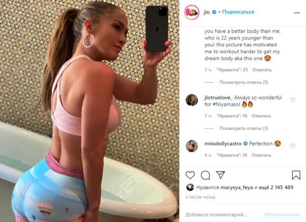 Как известно, несмотря на возраст, артистка выглядит удивительно и стройно. В этот раз она поделилась пикантным кадром прямо из ванной. На новом фото Лопес показала себя в естественном и жарком виде - тесных модных лосинах с ярким принтом и стильным топом нежно-розового оттенка. При этом на лице звезды заметен легкий макияж, а светлые локоны завязаны в высокий хвост. Поклонники не смогли пройти мимо: «В следующем месяце вам исполнится 51 год, и ваше тело будет лучше моего, которое на 22 года моложе вас! эта картина побудила меня тренироваться усерднее, чтобы получить тело своей мечты😍», «Всегда так замечательно для #Niyamasol 🔥🔥», «Совершенство, аппетитная конфетка 😍», «Так прекрасна моя королева. 👑😍», «Te amo muito Дженнифер ❤️», «Красивая женщина внутри и снаружи. 😍», «Если есть одна вещь, в которой я уверен, так это то, что она замечательная, и я никогда не устану повторять это каждый день. 🔥❤», «Так горячо. 🔥😍👑🙌», «Ты и всегда будешь моим главным вдохновителем в жизни. ❤️❤️». Стоит отметить, что Джей Ло произвела настоящий фурор, когда появилась в финале показа Versace весна-лето 2020 в длинном зеленом платье. А указанный короткий наряд того же дизайна, звезда надела на вечеринку после показа. Только свой образ она дополнила яркими ботфортами. Видимо красотка скучает по тем временам, когда щеголяла перед людьми в роскошных нарядах. Поскольку фото были обнародованы в сториз, никто из подписчиков не смог открыто их прокомментировать. Напомним, что 50-летняя Джей Ло взбудоражила образом юной девушки, возраст не помеха: «Ух, горячо». Как сообщала Politeka, Дженнифер Лопес взбудоражила помолодевшим видом, возраст ей к лицу: «Хороша чертовка». Также Politeka писала, что любовник Джей Ло без стыда показал, как развлекается со звездой: нескромные кадры покорили сеть. admixerML.fn.push(function() { admixerML.defineSlot({z: 'c77fecf6-2ac9-46a6-a7a8-03546d99ebbd', ph: 'admixer_c77fecf62ac946a6a7a803546d99ebbd_zone_17512_sect_5048_site_4397', i: 'inv-nets', noBannerCallback: function () { admixerML.fn.push(function () { admixerML.display('admixer_c41b74c2059c4dc79622c5388ec479af_zone_17581_sect_5048_site_4397'); }); } }); admixerML.defineSlot({z: 'c41b74c2-059c-4dc7-9622-c5388ec479af', ph: 'admixer_c41b74c2059c4dc79622c5388ec479af_zone_17581_sect_5048_site_4397', i: 'inv-nets', renderedCallback: function(slot) { var height = (slot.items && parseInt(slot.items[0].height)) || slot.height; var fw = slot.ph.getElementsByTagName('iframe')[0].contentWindow; if (fw.player){ openFullVideo(fw.player, height); } else { var interval = setInterval(function(){ if (window.player) { clearInterval(interval); openFullVideo(window.player, height); } }, 16); admixerML.fn.push(function() { admixerML.defineSlot({z: 'c77fecf6-2ac9-46a6-a7a8-03546d99ebbd', ph: 'admixer_c77fecf62ac946a6a7a803546d99ebbd_zone_17512_sect_5048_site_4397', i: 'inv-nets', noBannerCallback: function () { admixerML.fn.push(function () { admixerML.display('admixer_c41b74c2059c4dc79622c5388ec479af_zone_17581_sect_5048_site_4397'); }); } }); admixerML.defineSlot({z: 'c41b74c2-059c-4dc7-9622-c5388ec479af', ph: 'admixer_c41b74c2059c4dc79622c5388ec479af_zone_17581_sect_5048_site_4397', i: 'inv-nets', renderedCallback: function(slot) { var height = (slot.items && parseInt(slot.items[0].height)) || slot.height; var fw = slot.ph.getElementsByTagName('iframe')[0].contentWindow; if (fw.player){ openFullVideo(fw.player, height); } else { var interval = setInterval(function(){ if (window.player) { clearInterval(interval); openFullVideo(window.player, height); } }, 16); admixerML.fn.push(function() { admixerML.defineSlot({z: 'c77fecf6-2ac9-46a6-a7a8-03546d99ebbd', ph: 'admixer_c77fecf62ac946a6a7a803546d99ebbd_zone_17512_sect_5048_site_4397', i: 'inv-nets', noBannerCallback: function () { admixerML.fn.push(function () { admixerML.display('admixer_c41b74c2059c4dc79622c5388ec479af_zone_17581_sect_5048_site_4397'); }); } }); admixerML.defineSlot({z: 'c41b74c2-059c-4dc7-9622-c5388ec479af', ph: 'admixer_c41b74c2059c4dc79622c5388ec479af_zone_17581_sect_5048_site_4397', i: 'inv-nets', renderedCallback: function(slot) { var height = (slot.items && parseInt(slot.items[0].height)) || slot.height; var fw = slot.ph.getElementsByTagName('iframe')[0].contentWindow; if (fw.player){ openFullVideo(fw.player, height); } else { var interval = setInterval(function(){ if (window.player) { clearInterval(interval); openFullVideo(window.player, height); } }, 16); admixerML.fn.push(function() { admixerML.defineSlot({z: 'c77fecf6-2ac9-46a6-a7a8-03546d99ebbd', ph: 'ad