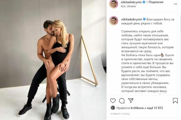 net. В кадре Никита позирует в одних штанах, демонстрируя поджарый торс. Даша же в черном боди и грубых ботинках села супругу на руки. Никита призвал подписчиков не спешить в отношениях и искать настоящую любовь: "Не бойтесь пока быть одни