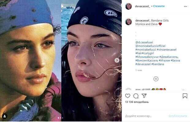 Так, недавно она поделилась снимком, на котором изображена сама Дева в бандане, а также ее мать в юности, на голове которой – аналогичный убор. «Бандана девочки Моника и Дева», – подписала снимок дочь актрисы. Как видно в публикации, девушка очень похожа на свою мать, хотя разрез глаз, брови и лоб ей достались от отца, актера Венсана Касселя, в браке с которым Моника прожила 14 лет. Красота актрисы более мягкая, в то время как ее дочь выглядит несколько дерзкой. В комментариях одни пользователи написали, что Дева – точная копия своей матери, а были и те, кто отметил, что Моника таки будет покрасивее. Мал кто знает, что Венсан Кассель три раза звал Монику замуж, три раза роковая красавица давала отказ. А однажды мужчина попал в небольшую аварию. Тогда актриса перепугалась не на шутку и согласилась стать женой актера. Вскоре у них состоялась свадьба. Спустя несколько лет жизни в браке у супругов появилась дочь Дева Кассель. На момент рождения первенца Монике Беллуччи было 40 лет. Вторую дочь актриса родила спустя 6 лет, девочку назвали Леони. Напомним, что дочь Моники Беллуччи сразила красотой и пышными формами, вся в мать: «Выросла девочка». Как сообщала Politeka, Дева Кассель произвела фурор видом в бикини, кадры: «Унаследовала всю красоту матери». Также Politeka писала, что Дева Кассель сверкнула роскошью в экстра-мини, Кассель не выдержал: «Вся в мать».
