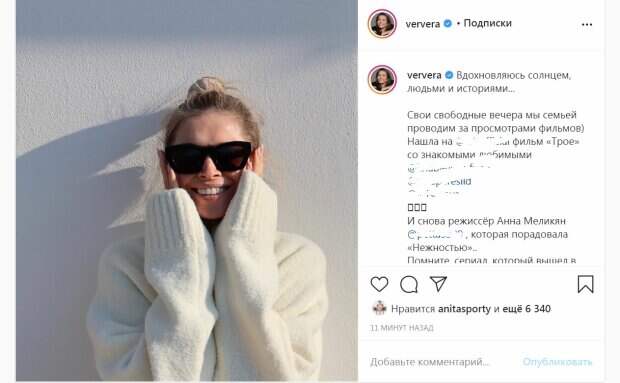 На красотку падал солнечный свет, делая снимок каким-то теплым. Брежнева сделала на голове высокий пучок. Она надела темные очки и широко улыбнулась. "Вдохновляюсь солнцем, людьми и историями... Свои свободные вечера мы семьей проводим за просмотрами фильмов) Нашла... фильм «Трое» со знакомыми любимыми @khabensky_fund @juliaperesild @v_isakova