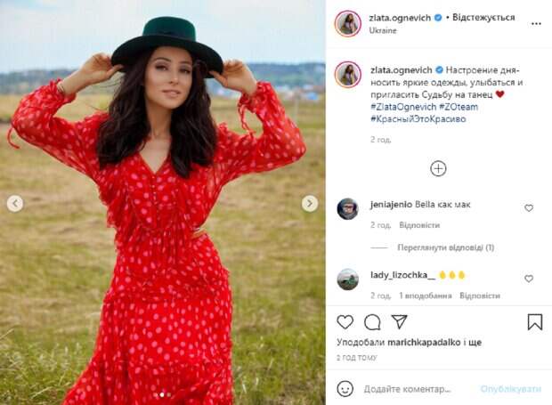 Кадры из новой яркой фотосессии артистка опубликовала на своей странице в соцсети. На снимках Злата запечатлена на прогулке за городом. Она появилась перед камерой в легком красном платье в белый горошек, которое красиво подчеркнуло идеальную фигуру и соблазнительные изгибы тела, а свой образ дополнила темной шляпкой. Волосы певицы здесь темные, хотя еще недавно она была блондинкой, они небрежно уложены и чуть растрепаны ветерком, а на ее лице аккуратный макияж с кокетливыми черными стрелками. Звезда в разных позах вертится перед фотографом, демонстрируя необычный образ и обаятельную харизму. В подпсии к публикации Огневич написала: "Настроение дня – носить яркие одежды, улыбаться и пригласить Судьбу на танец". Пользователи тут же принялись активно обсуждать новые фотографии артистки, засыпая ее комплиментами в комментариях к публикации. "Как вы прекрасны с этим цветом волос", "Похожа на горячую испанку", "Злата, Вы прекрасны! Пусть все будет так, как Вы хотите", "Невероятная", "Богиня наша", "Самая красивая", "Какая красотка, не узнать", - пишут в комментариях к фото. Напомним, скандалом обернулась победа Златы Огневич на шоу "Маска", украинцы кипят: "То чувство, когда тебя обманули". Как сообщала Politeka, 35-летняя Злата Огневич поделилась пикантной подробностью своей свадьбы: "Представляю, как срываю платье и...". Также Politeka писала, что победитель "Маски" перевернул все с ног на голову, украинцы такого не ожидали: "Испортить такое шоу...".