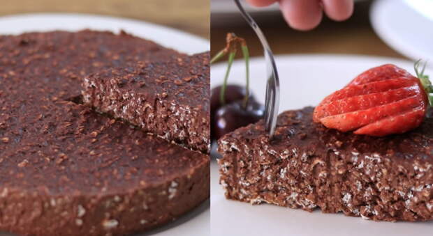 Должна получиться однородная шоколадная смесь. Добавить овсяные хлопья, перемешать. Дно формы застелить пергаментом, и смазать маслом. Переложить шоколадную массу, разровнять лопаткой. Кекс должен полностью остыть при комнатной температуре. Затем убрать его в холодильник на 3-4 часа. [embed][/embed]