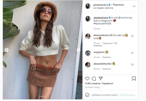 Об этом пишет Politeka.net со ссылкой на станичку знаменитости. "Милый топ и винтажная юбка", - написала звезда под фото. "Вы видите мое ... тело", "Ты такая классная", "Самая красивая девушка", "Понравился внешний вид да или конечно? Я хочу эту юбку на вчера!", "Обожаю эту меховую шапку и этот укороченный джемпер", "Ваши фотографии приятны", "Самая горячая", "Бомбическая королева", "Крутой образ", ""Вау, так прекрасна", "Вы выглядите потрясающе, потому что каждая часть вас кажется идеальной". Мы писали, что популярная модель бренда Victoria's Secret Жизель Оливейра похвасталась идеальной фигурой в откровенном черном платье. Так, на фото Оливейра позирует в компании другой красотки-модели Бруны Лирио. Девушки демонстрируют соблазнительные мини-платья. Напомним, бразильская звезда из Victoria's Secret распахнула рубаху и показала, что под ней прятала А еще Politeka писала, что бразильская красотка из Victoria's Secret в дерзком мини приковала к себе взгляды Также Politeka сообщала, что звезда Victoria's Secret увлекла бесконечными ножками в слишком коротком мини