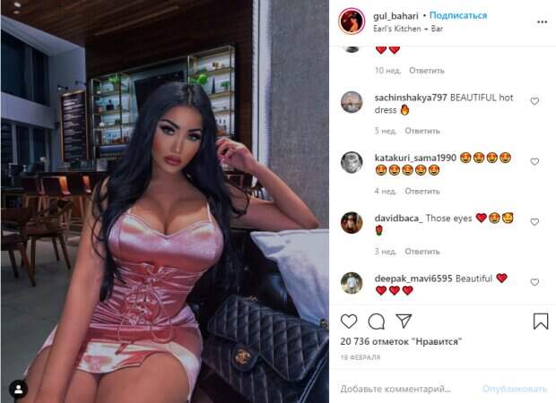 Модели очень нравится, когда ее грудь едва ли не вываливается из декольте, поэтому она подбирает образы с довольно смелыми вырезами. В этот раз тонкое мини-платье из атласной ткани розового цвета впечатлило поклонников. Дополненное тоненькими лямками и корсетом со шнуровкой спереди, платье выглядело очень эффектно. Особенно на фигуре Бахари. Девушка распустила длинные локоны и нанесла на загорелое лицо идеальный макияж, превращающий ее лицо в кукольное. Розовые губы знаменитости выглядели весьма удачно в сочетании с тенями с блестками. «Самая сладкая девочка», «Почему так романтично, здесь нельзя стыдиться», «Просто куколка классная», «Пожалуйста, добавьте еще несколько фото в этом платье