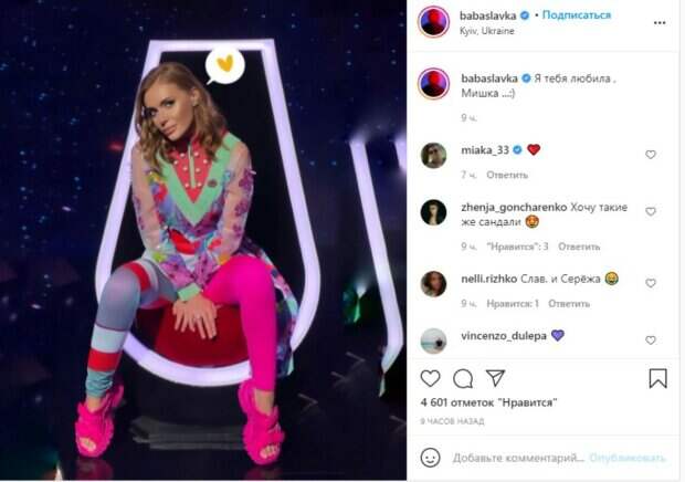 И Слава уже успела выпустить несколько песен, а также пару дней назад показала, как отняла новый клип. В этот же раз Слава порадовала ярким фото в необычном цветастом наряде асимметричного кроя. На снимке певица позировала с распущенными локонами, ярким макияжем с акцентом на скулы и простыми аксессуарами. Розовые босоножки, попадающие в тон с лосинами удачно гармонировали между собой. Слава же в подписи шутливо вспомнила слова из песни «Я тебя любила», в которой певица поет о бывшем парне и говорит о своих чувствах. Поддать интриги Каминская решила таким способом, ведь в ее личную жизнь поклонники часто лезут с неуместными вопросами. Нередко артистка подшучивает над фанатами, интригуя жизнью после развода «Я тебя любила, Мишка ...:)», - написала Слава. «Хочу такие же сандали